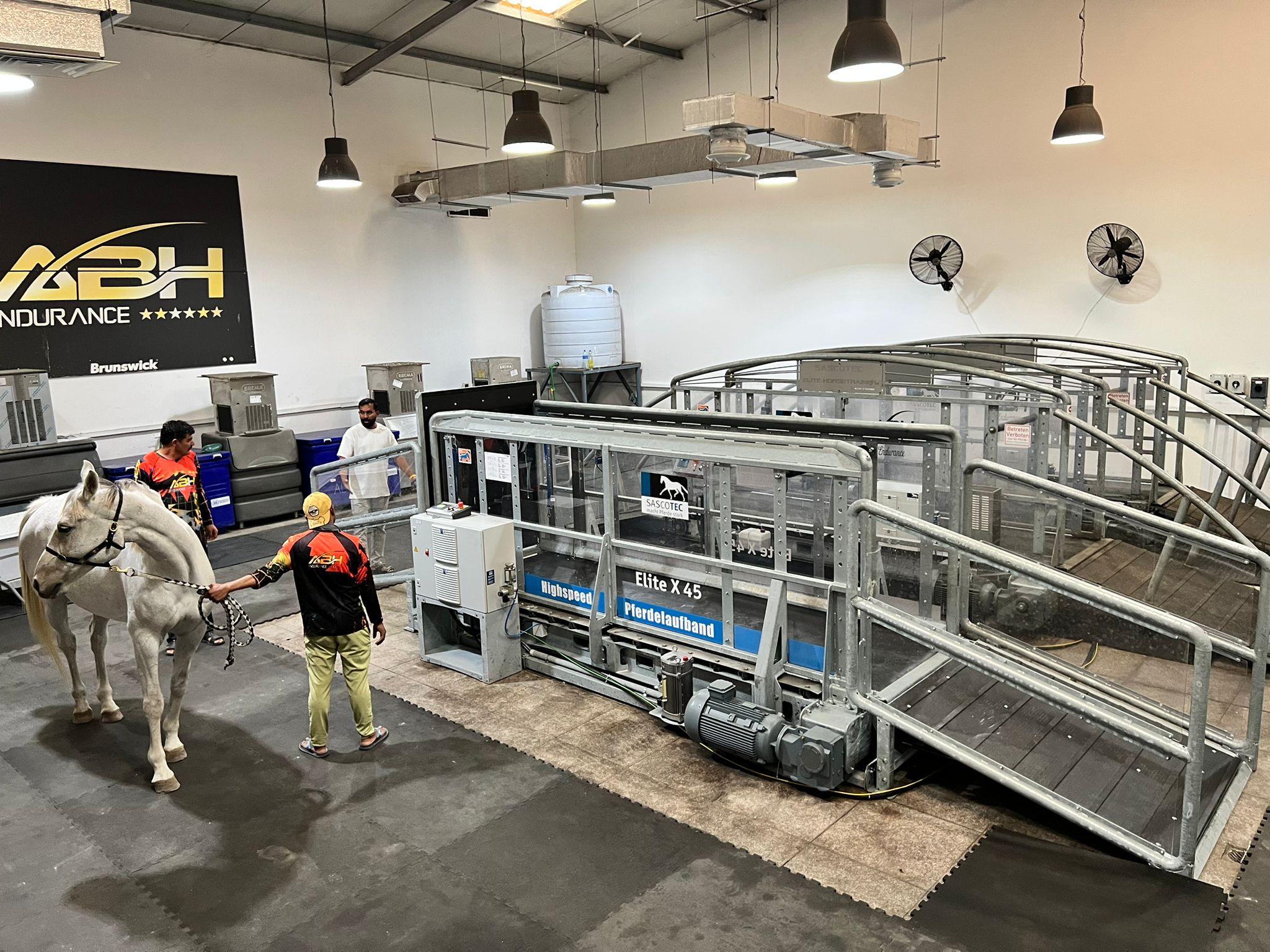 Das längste Pferdelaufband für höchste Sicherheit. Das Elite X45 ist das schnellste Serien-Pferdelaufband von Sascotec und für das Galopptraining ausgelegt. Die nach innen geformte Reling sorgt dafür, dass das Pferd bei gleich bleibender Laufbreite während des Trainings die Spur hält.